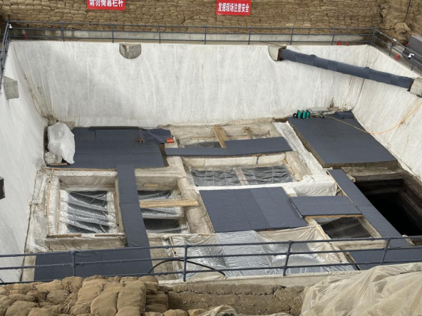 2020年9月起,一號墓發(fā)掘工作開(kāi)始。至2023年11月,完成封土和填土發(fā)掘,12月提取了槨室上鋪設的竹席。這期間,建設了一號墓現場(chǎng)保護大棚和文物庫房、文物保護實(shí)驗室、宿舍等必要的配套設施。2024年3月7日開(kāi)始拆解提取槨蓋板,至3月27日,四層槨蓋板已全部安全提取完成,共計443根,總重約153噸?,F已進(jìn)入槨室發(fā)掘第二階段,即槨室內部的發(fā)掘清理。