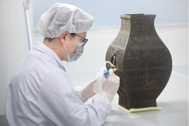 “在武王墩一號墓考古發(fā)掘過(guò)程中,國家文物局考古研究中心、北京科技大學(xué)、中國絲綢博物館等組成的文物保護團隊緊密配合考古發(fā)掘工作,通過(guò)多學(xué)科、多平臺協(xié)作,運用科學(xué)技術(shù)提供的新手段新工具,開(kāi)展槨室環(huán)境控制及各類(lèi)出土文物的加固提取與穩定性保護,保障了考古發(fā)掘工作的順利開(kāi)展和文物安全?!睆堉螄榻B。